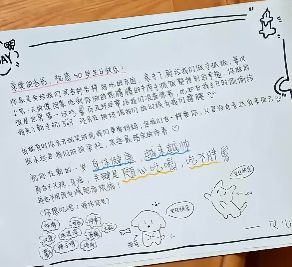 吹完蜡烛后,贝儿和小叶子拿出了手写的信件,轮流念给爸爸听。