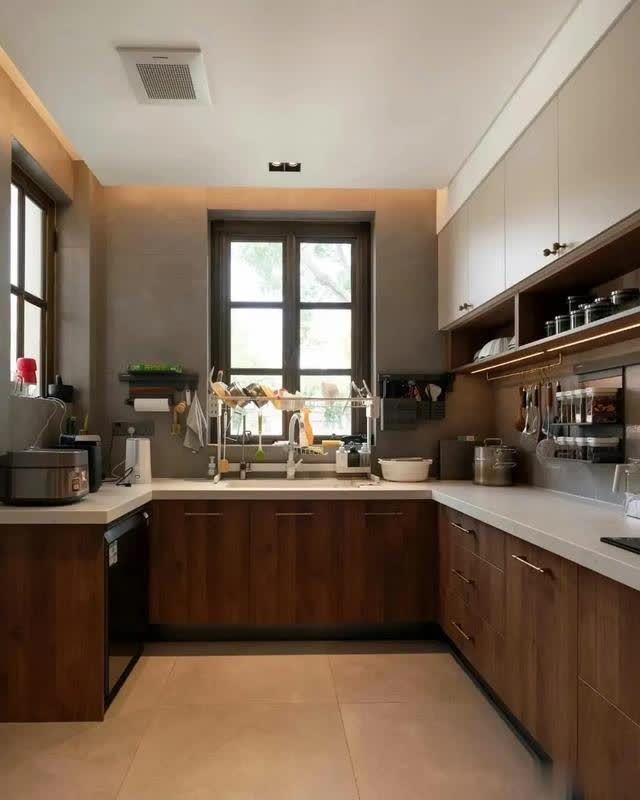 厨房的设计,采用了U型结构,能最大程度的收纳各种厨房用品,不过,从整齐的台面上可以看出,房主也是热衷于收纳的人。巧妙的利用了墙面空间,将物品置于上面,干净整洁,同时后续使用又非常方便。
