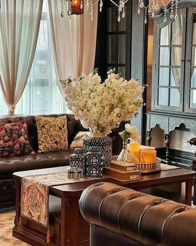 从茶几上的满瓶花束可以看出,房主确实对生活充满了热爱,也比较注重日常的视觉享受,放到茶几上,让人一眼就看到,十分吸睛!且装花的容器,也十分有特色,青白花纹的肌理,让人不由的想到了青花瓷。